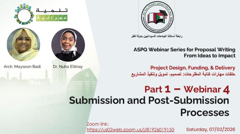 Khartoum, Sudan – The ASPQ Webinar Series resumes this evening with its fourth session, focusing on the critical stage of Submission and Post-Submission. Under the theme “From Ideas to Impact Project Design, Funding, and Delivery”, the event aims to guide participants through the journey of turning innovative concepts into funded, implementable projects.