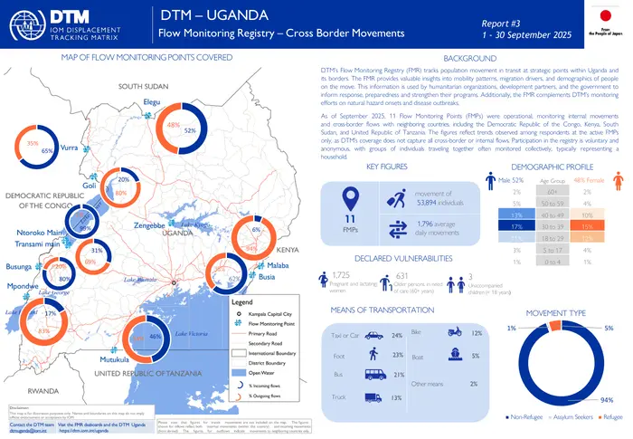 As of September 2025, 11 Flow Monitoring Points (FMPs) were operational, monitoring internal movements and cross-border flows with neighboring countries, including the Democratic Republic of the Congo, Kenya, South Sudan, and United Republic of Tanzania.