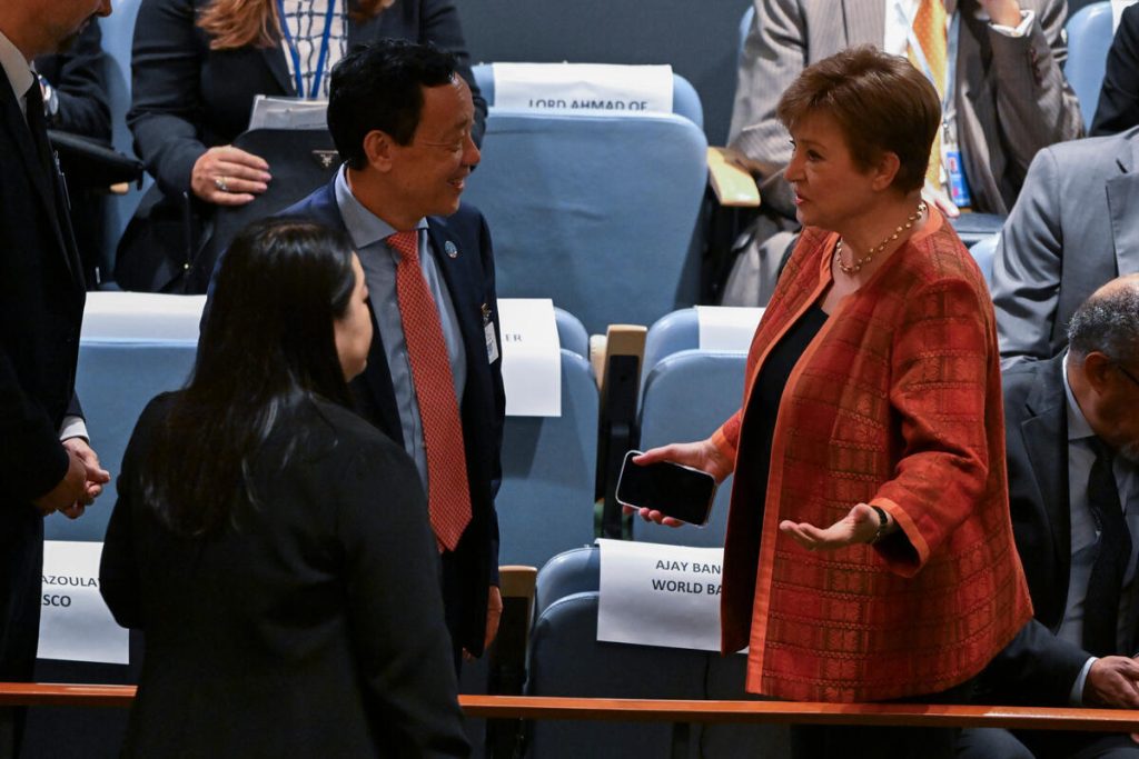 23 September 2025, New York City, USA. FAO Director-General QU Dongyu (L) speaks with Kristalina Georgieva, the Managing Director of the International Monetary Fund as they gather for the General Assembly – 80th Session, Opening of the General Debate at UNHQ in New York City, USA.