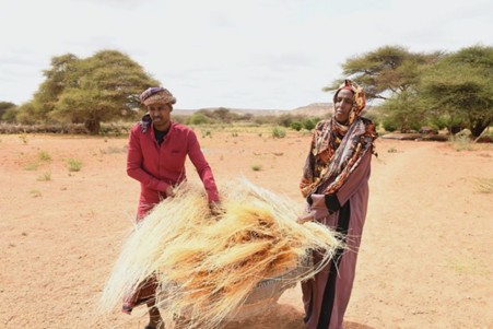 Fadumo Jama Isse (right) and a colleague carry harvested fodder grass. ©FAO/Raymeg Consultants/Philip Namayo