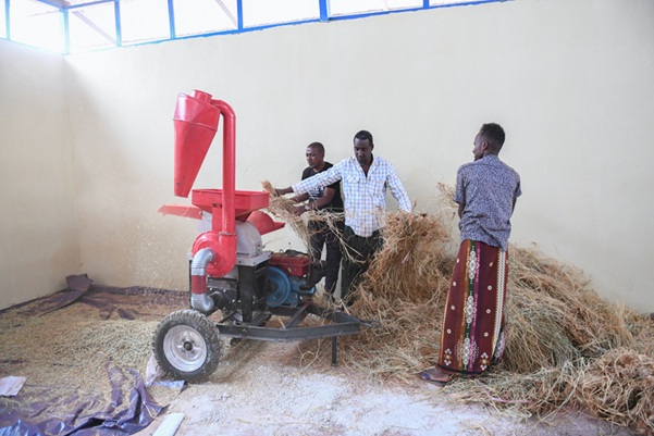 Inside the Guriceel Farmers Association fodder shed, Hassan Abdi Gurhan (checked shirt) and colleagues process harvested fodder. ©FAO/Raymeg Consultants/Philip Namayo