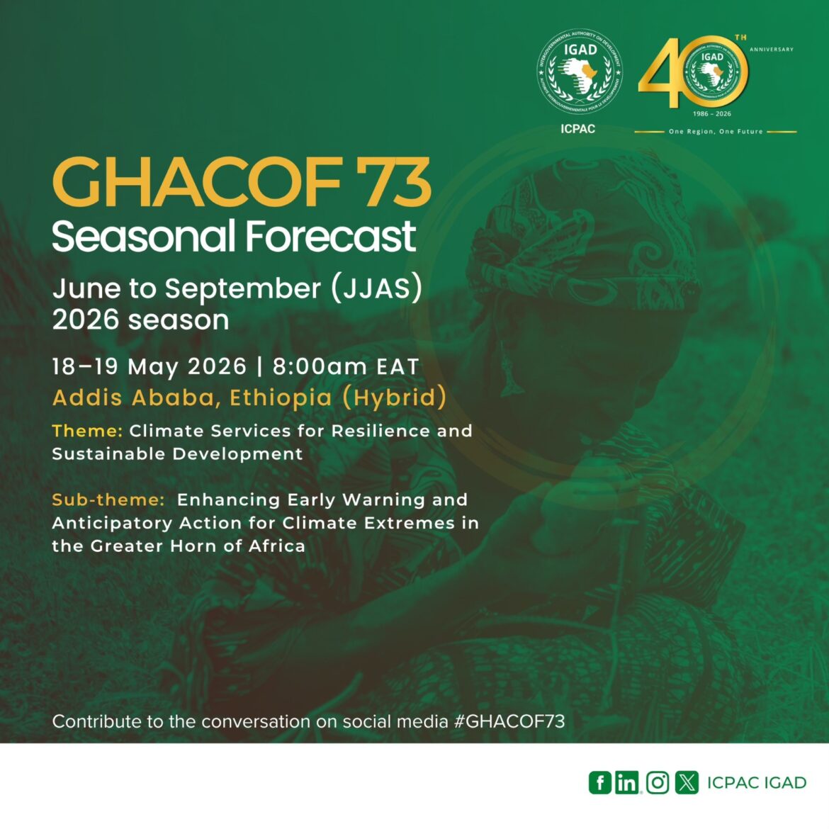 The 73rd Greater Horn of Africa Climate Outlook Forum (GHACOF 73) will take place in Addis Ababa on 18–19 May 2026, convened by the IGAD Climate Prediction and Applications Centre (ICPAC).