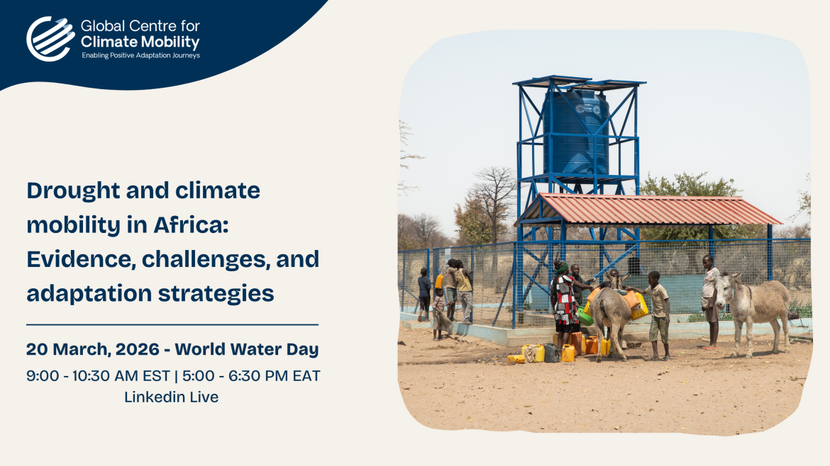 On 20 March 2026, the Global Centre for Climate Mobility (GCCM) will host a virtual event examining how drought is reshaping patterns of climate mobility across Africa. Timed to coincide with World Water Day, the session will run from 9:00–10:30 AM EST (5:00–6:30 PM EAT) and will be broadcast live on LinkedIn.