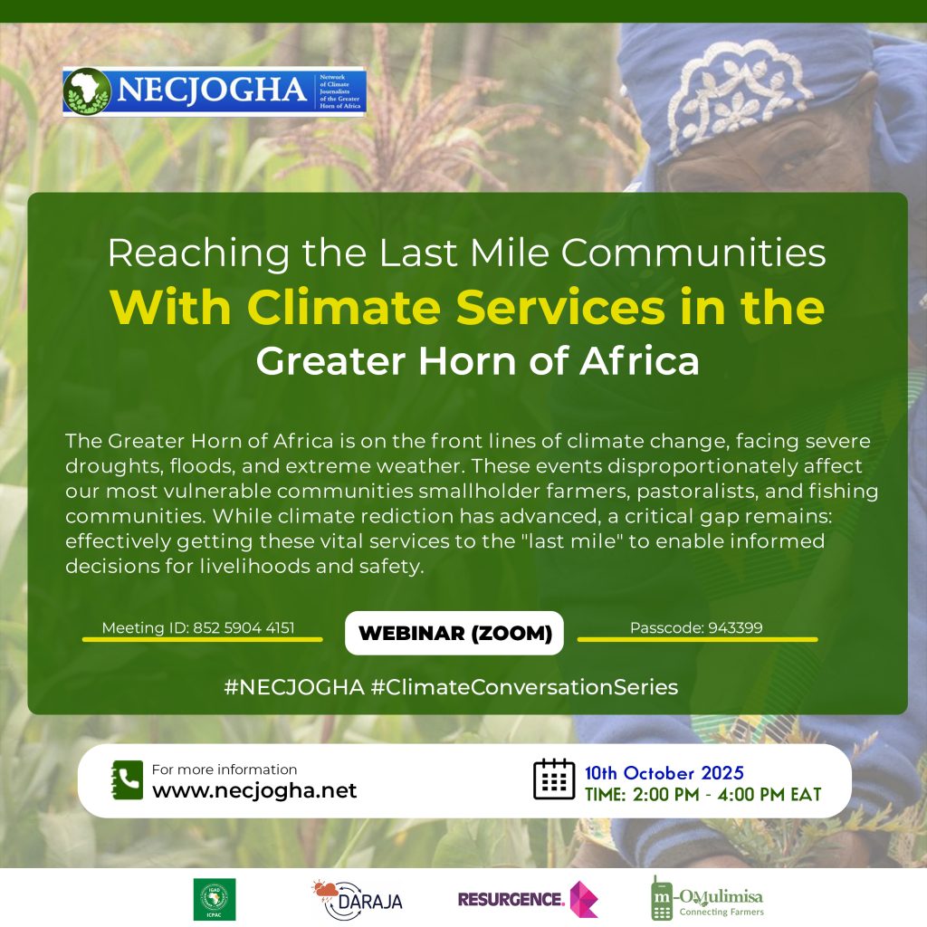 Kampala, Uganda – The Network of Climate Journalists in the Greater Horn of Africa (NECJOGHA) will organize a “Climate Conversation” series on October 10, 2025, to highlight innovative approaches to bridge the critical gap in disseminating climate services to “last-mile” communities. This important event will showcase successful models and technologies empowering remote and underserved populations with vital climate information in a region highly vulnerable to climate change impacts.