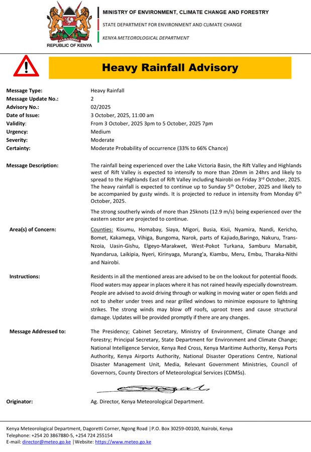 According to the advisory, rainfall exceeding 20mm in 24 hours is expected to intensify over the Lake Victoria Basin, the Rift Valley, and the Highlands west of the Rift Valley. By Friday, October 6, the rains are projected to spread to the Highlands east of the Rift Valley—including Nairobi—and continue into the weekend.