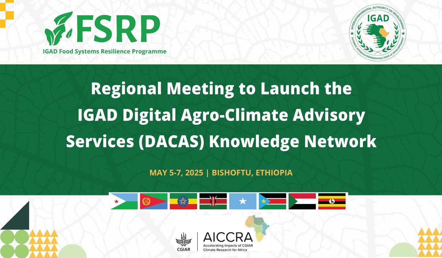 May 5–7, 2025 (Bishoftu, Ethiopia): The Intergovernmental Authority on Development (IGAD), with support from the Accelerating Impacts of CGIAR Climate Research for Africa (AICCRA), has officially launched the IGAD Digital Agro-Climate Advisory Services (DACAS) Knowledge Network. This milestone event brought together technical experts from IGAD Member States, and regional technical partners to discuss the terms of reference and action plan for the Network to facilitate knowledge exchange.